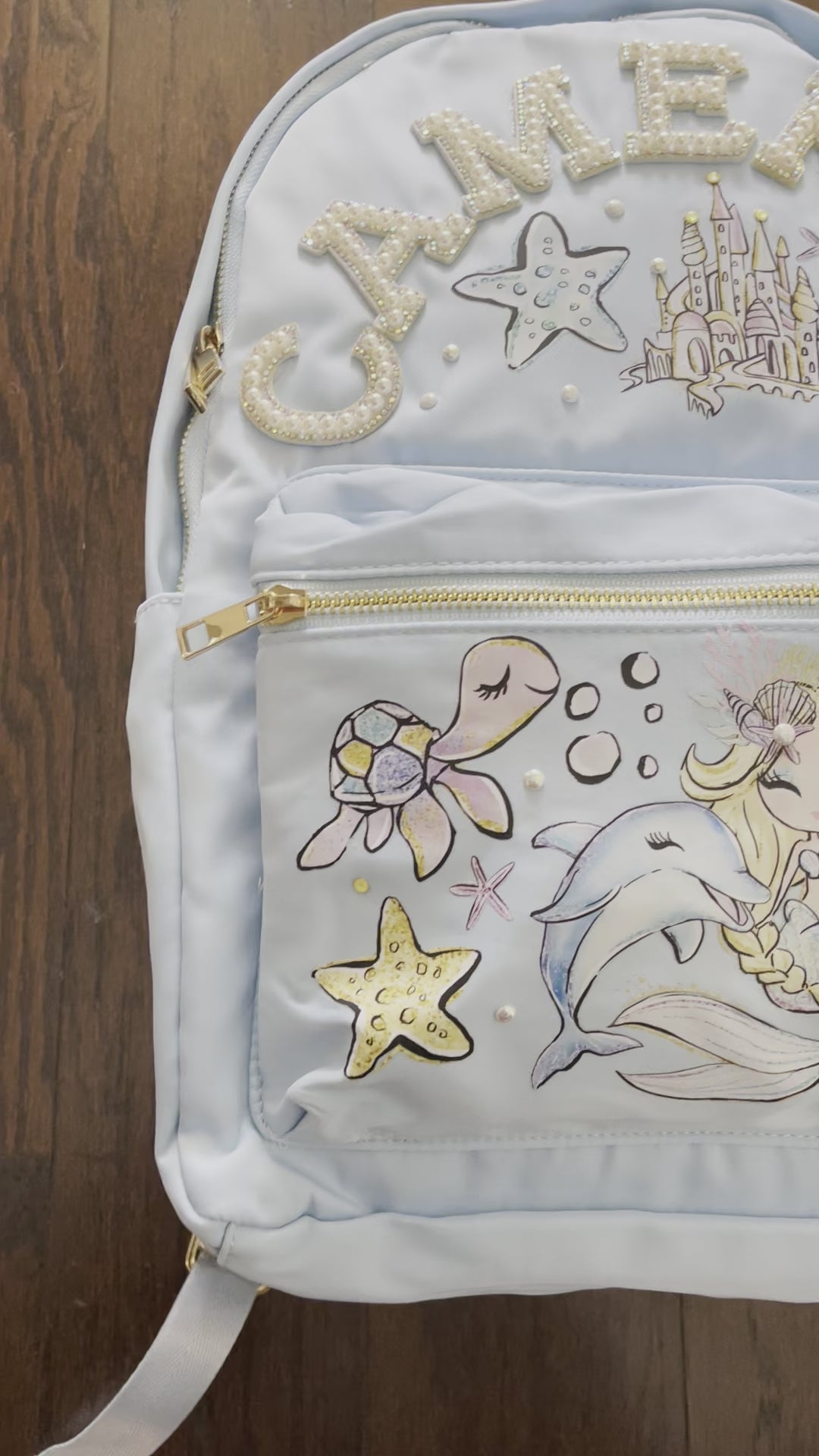 This adorable graphic design mermaid backpack will be sure to turn some heads! Backpacks are custom-made once ordered. The layout may vary slightly but all items will be arranged to best fit the size of the bag! This nylon, excellent quality bag is full-size b has a side pocket to fit a water bottle